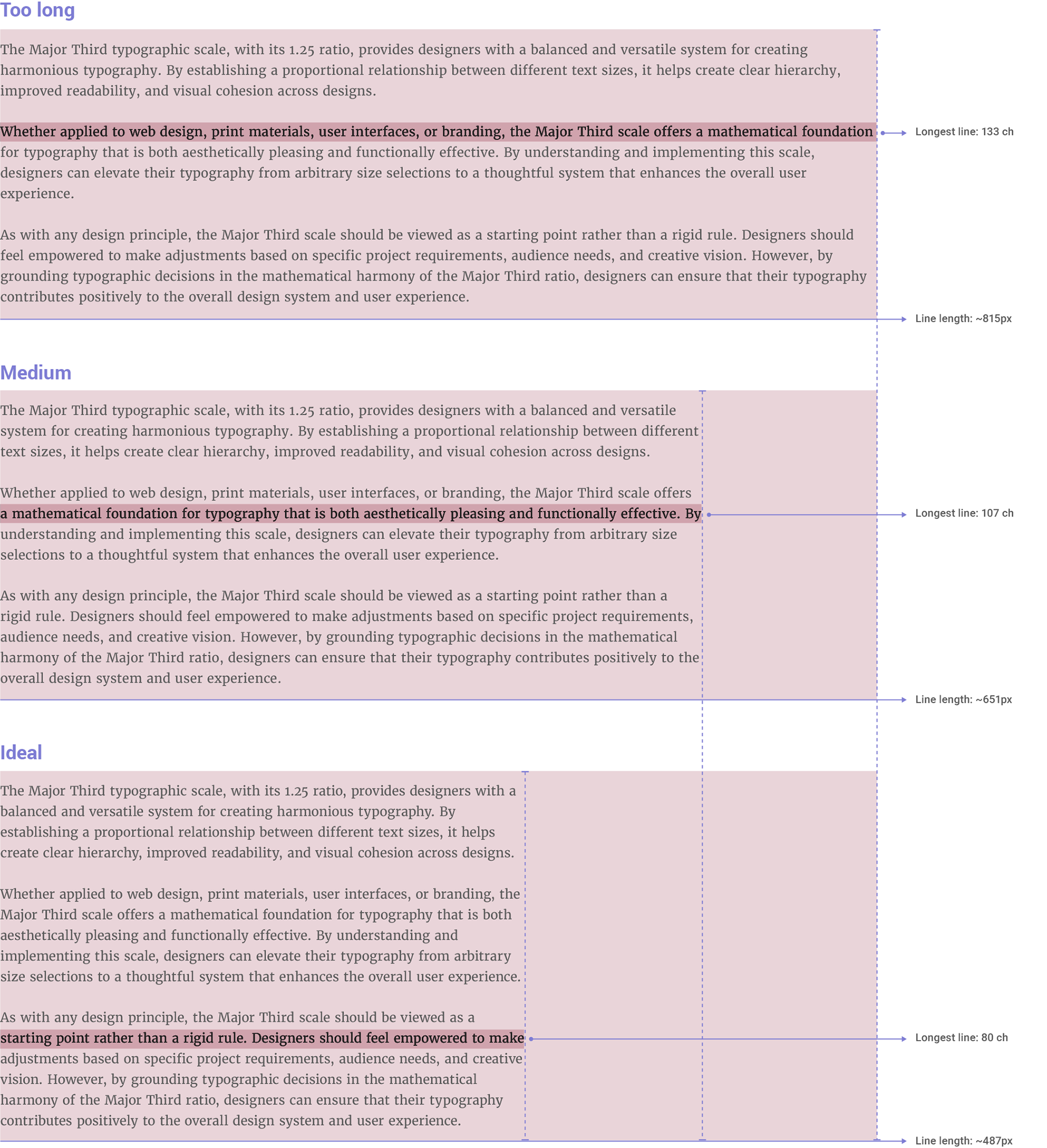 This guideline for line length is informed by established typographic principles, including Robert Bringhurst’s insights on line length and modern web accessibility standards. It ensures a consistent and comfortable reading experience for all users, regardless of their device or screen size.